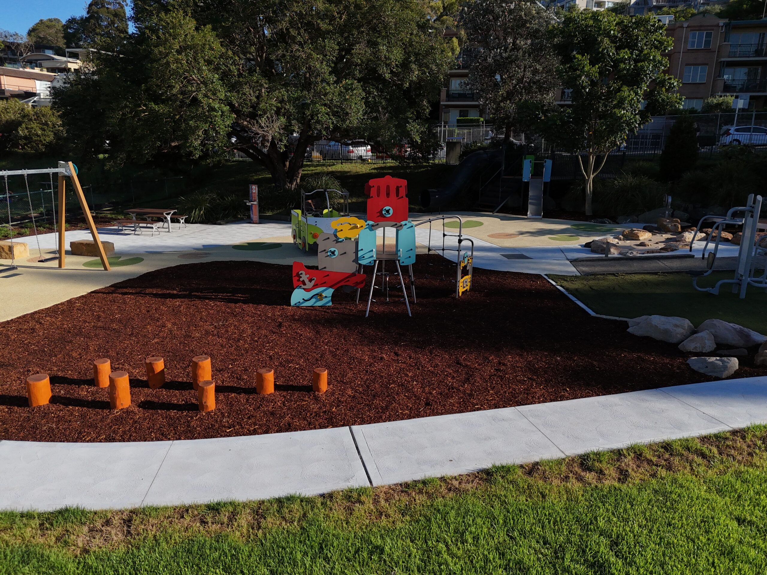 Merrett playground had been serving as the communities only park at Waverton from 80’s and has been very dear to the community. North Sydney Council engaged Umbaco Landscape Architects to design a new park keeping the same theme ‘Car’ theme in mind. The design was intricate within the small area to include water pump and water channel carved on sandstone blocks alongside sandstone feature rocks with exposed concrete finish …etc to revitalise the space for the next few decades. Our project delivery team has carried out a masterpiece work surpassing clients and designers expectation as seen in the pictures.